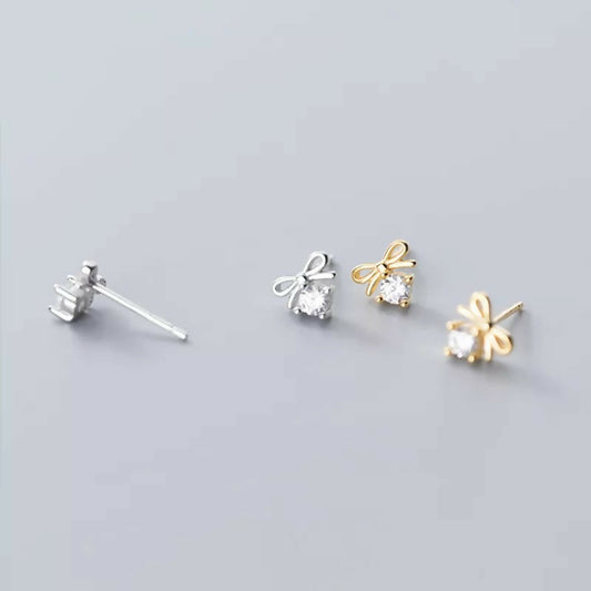 ANYCO Fashion Earrings Gold 925 Sterling Silver Sweet Bowknot Crystal Zircon Small Stud for Women Ladies Jewelry
