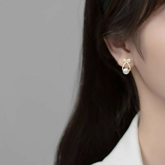 ANYCO Fashion Earrings Gold 925 Sterling Silver Shiny Zircon Bow Natural Pearl Hollow Stud for Women Jewelry