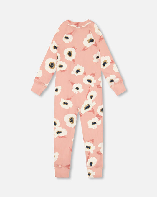 One Piece Thermal Underwear Pink Printed Off White Flowers