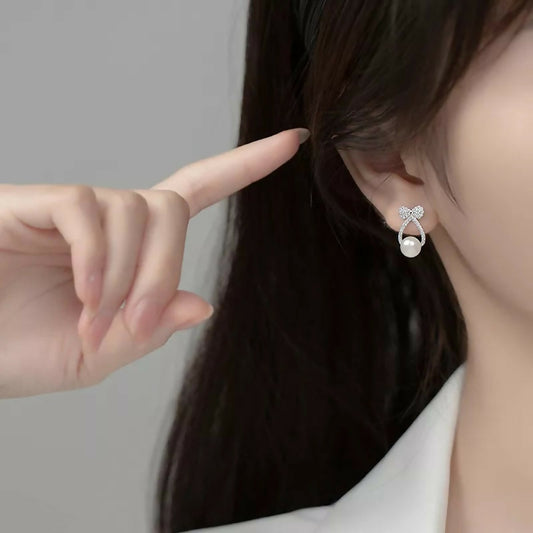 ANYCO Fashion Earrings Silver 925 Sterling Shiny Zircon Bow Natural Pearl Hollow Stud for Women Jewelry