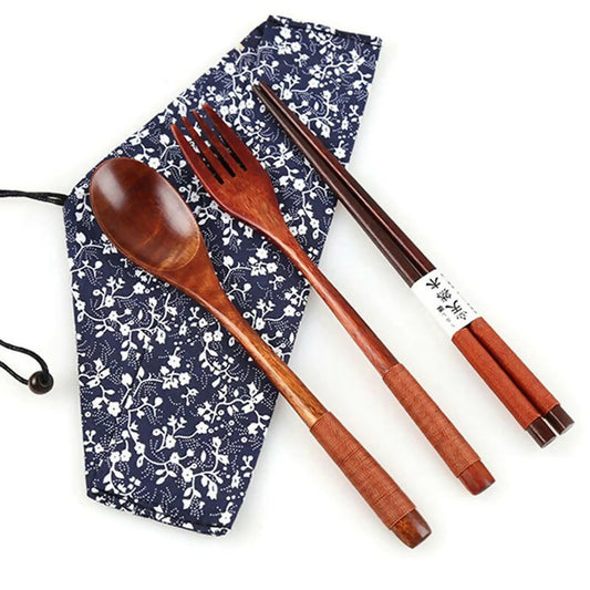 Anygleam Pouch 3pcs Orange Blue Dinnerware Set Wooden Spoon Fork