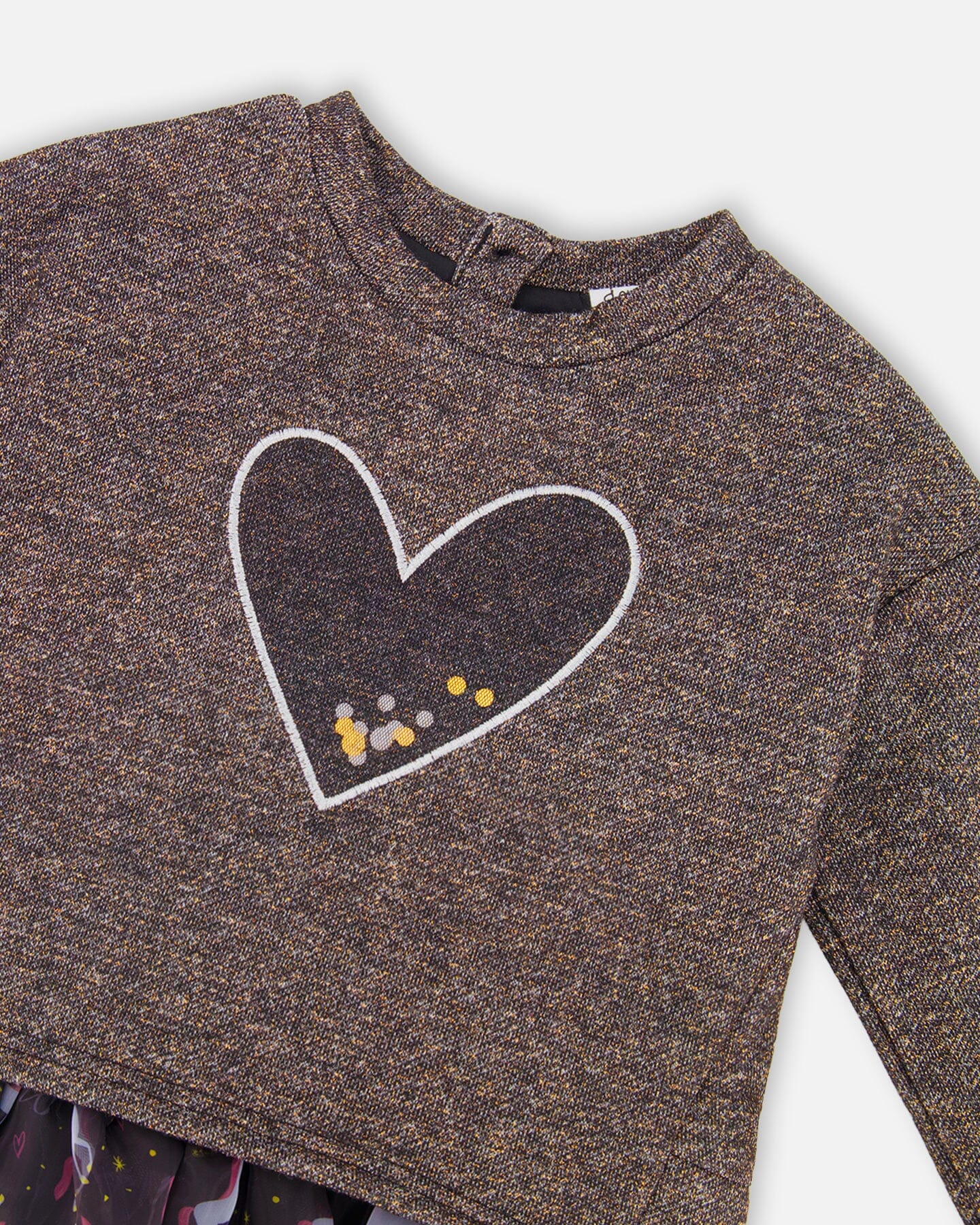 The Bi-Material Dress Dusty Black With Mesh Skirt and Heart brings a magical twist to casual dressing. This dreamy sweatshirt-style dress features a soft french terry bodice with a textured heart, and a flared mesh skirt with an allover unicorn print for extra flair. With a comfy fit and playful style, it’s perfect for parties, school, or weekend adventures.