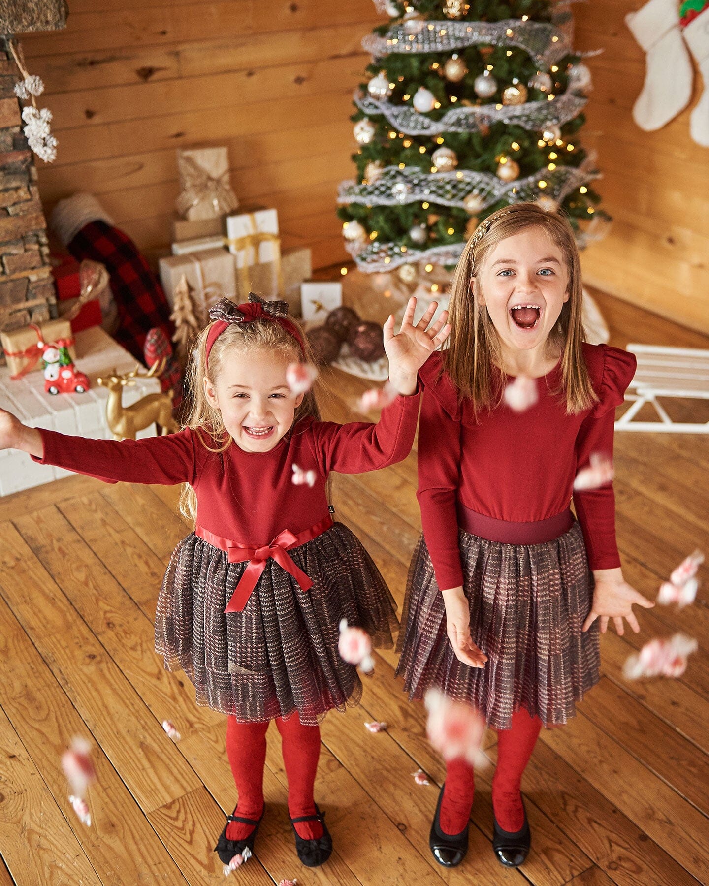 Our Bi-Material Dress with Glittering Tulle Skirt Red Plaid is holiday party perfection! The soft knit bodice features long sleeves and a round neckline, while the sparkling tulle skirt features a flared silhouette with multiple tiers and little ruffles. A pretty satin bow at the waistband adds the perfect finishing touch!