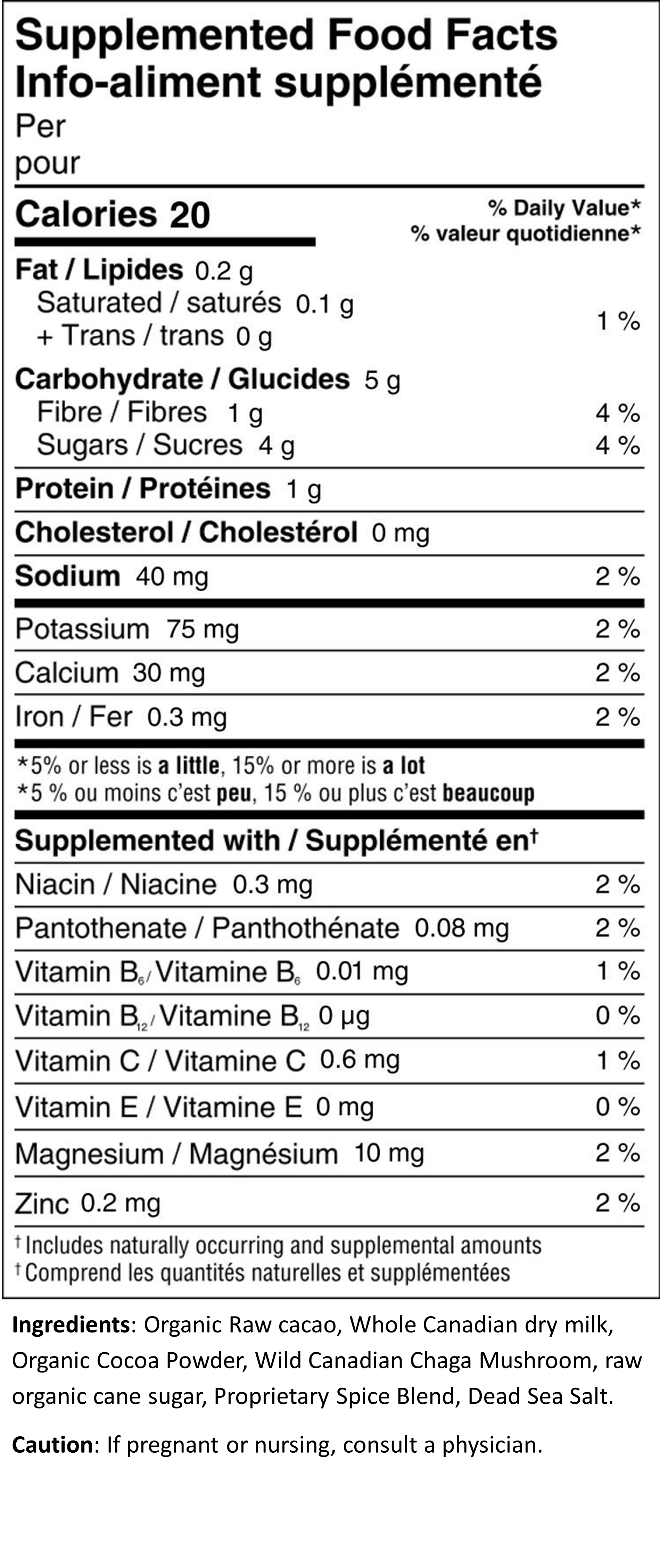 Ingredients: Organic Raw cacao, Whole Canadian dry milk, Organic Cocoa Powder, Wild Canadian Chaga Mushroom, raw organic cane sugar, Proprietary Spice Blend, Dead Sea Salt.
