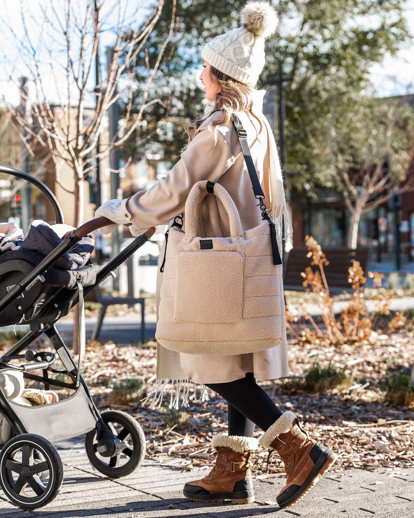 Our Changing Tote Sugar Swizzle is loaded with pockets and details to hold all of your mommy and baby essentials. The interior features a large pouch that contains a washable changing pad, elasticized pockets to hold baby bottles and food, and a zipper pocket to hold small accessories. The outside is detailed with a front zipper pocket, top handles, a detachable shoulder strap, and small detachable straps to attach to your stroller.