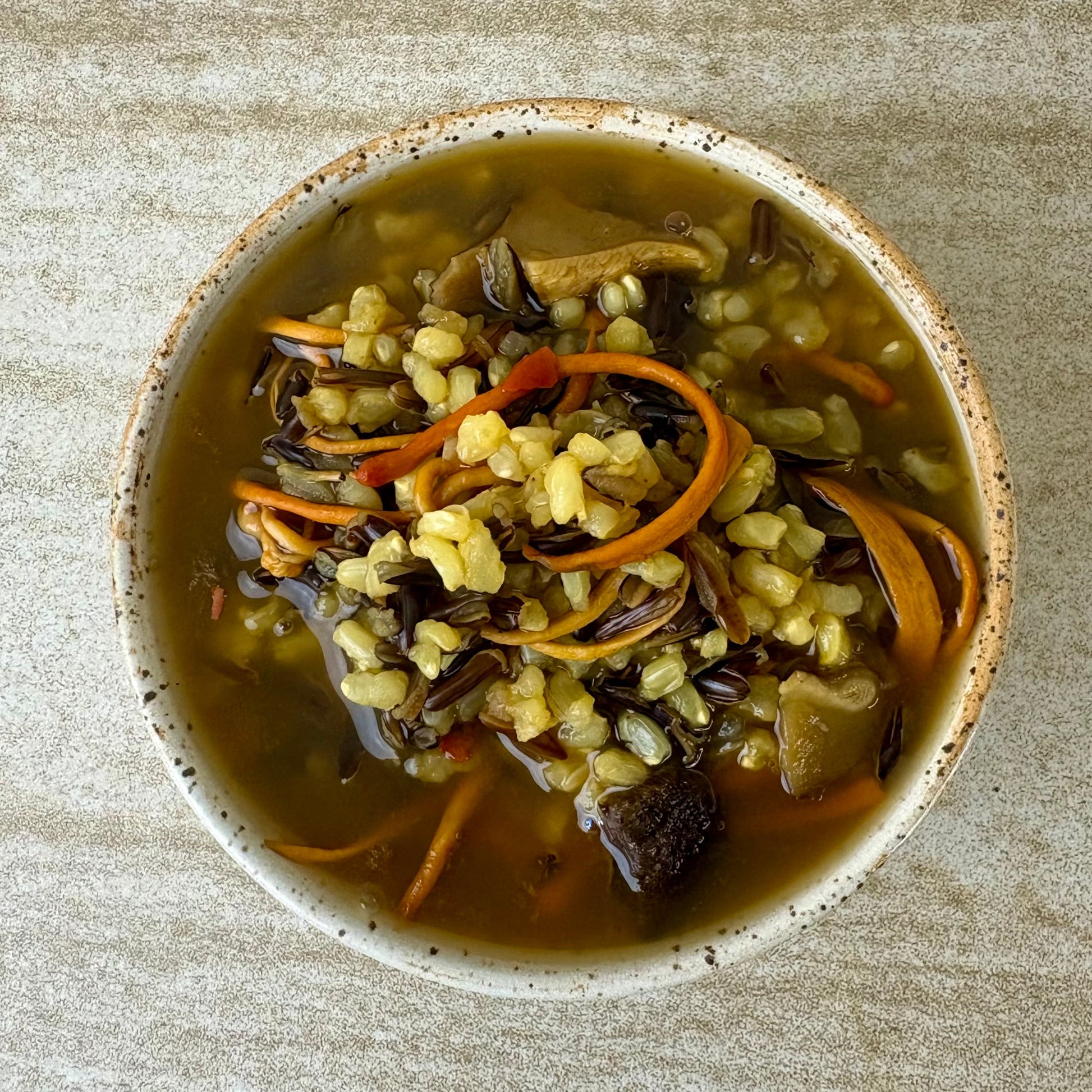 A woodland feast in a bowl. Our Forager’s Soup blends the nutty heartiness of wild and brown rice with a medley of forest mushrooms—lion’s mane, shiitake, maitake, porcini, chanterelle, black trumpet, reishi and cordyceps—each chosen for their deep, earthy flavor and time-honored nourishment.