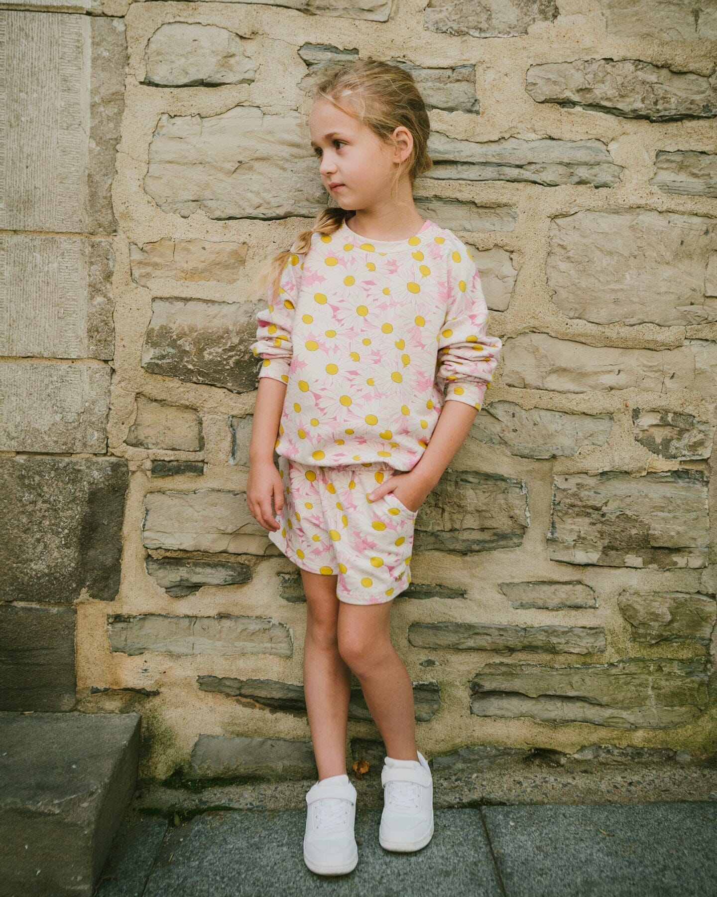 Playful and cozy, our French terry sweatshirt pink with printed daisies is the perfect piece for everyday adventures. This sweater features an allover daisy print, a round neckline, and an elasticized bottom hem that gives it a snug yet comfortable fit. As part of the “Explosion of Daisies” collection, it adds a cheerful floral vibe to any outfit.