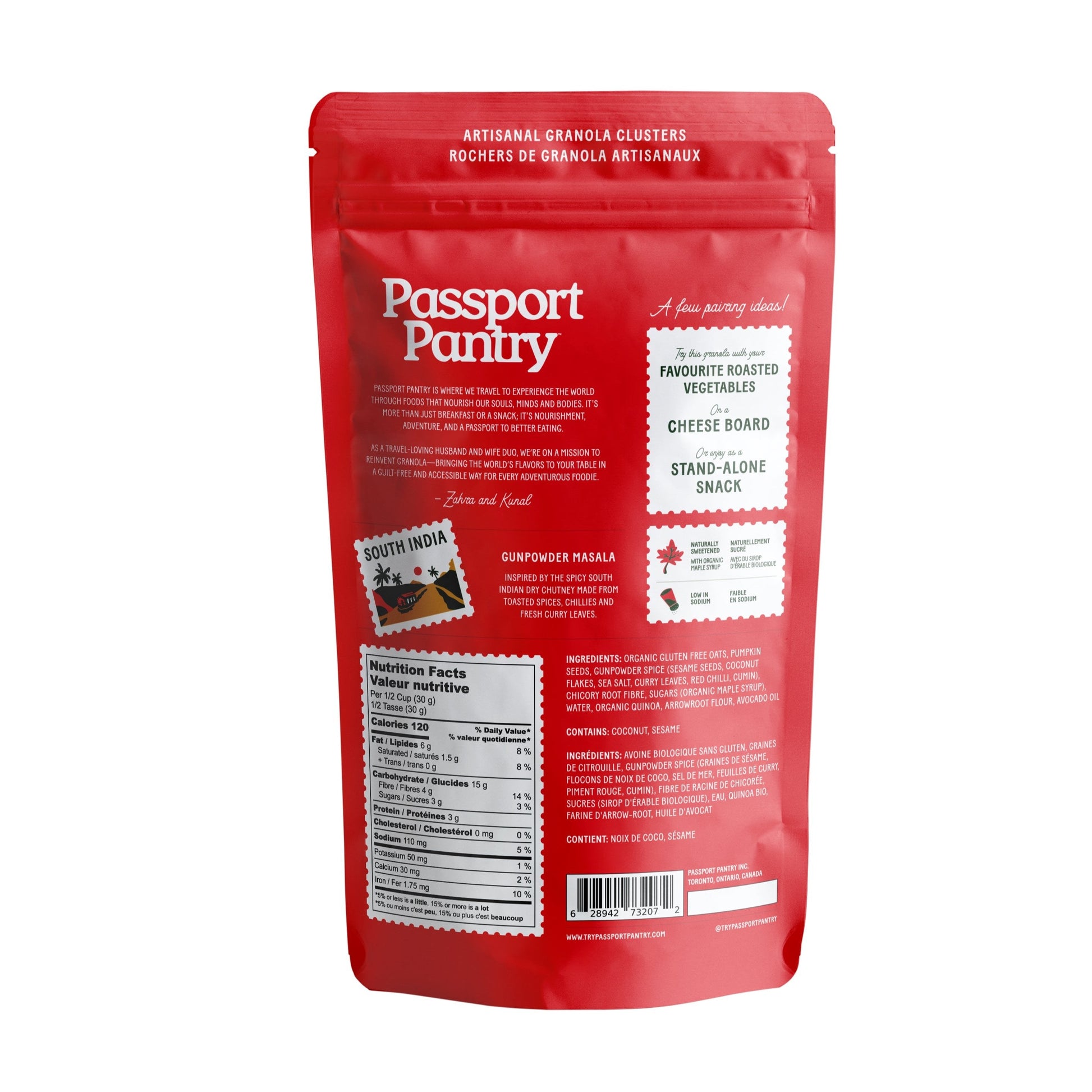 INGREDIENTS: Organic Gluten Free Oats, Pumpkin Seeds, Gunpowder Spice (Sesame Seeds, Coconut Flakes, Sea Salt, Curry Leaves, Red Chilli, Cumin), Chicory Root Fibre, Sugars (Organic Maple Syrup), Water, Organic Quinoa, Arrowroot Flour, Avocado Oil