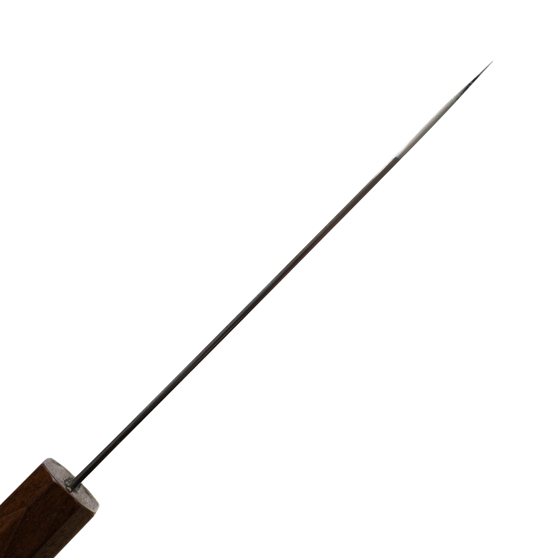 This petty has a beautiful layered Damascus blade -- truly a showstopper! Petty knives are great for all the little things: Chopping shallots and garlic, mincing herbs and butchering small proteins. They function perfectly as a line knife as well as they're nimble, don't take up much space but can still accomplish a wide variety of tasks. This also makes them a great option for home cooks looking for something capable they can leave out on the counter all day.