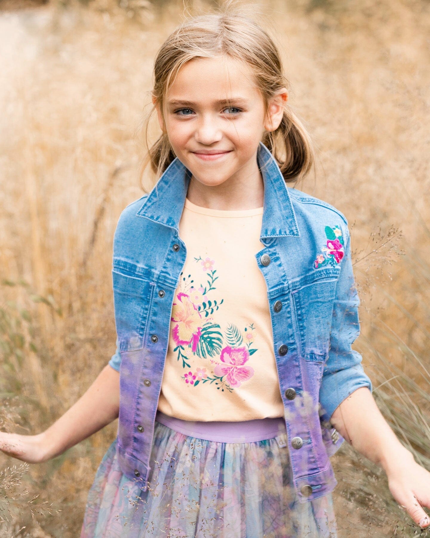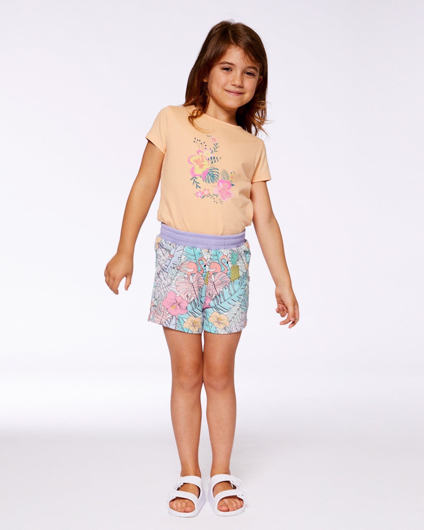 Our Organic Cotton Tee Light Orange and Flowers is sure to put her in a summer state of mind! This casual tee features a super comfy fit with short sleeves, a round neckline, and a tropical hibiscus floral print on the chest. Mix and match it with any short, legging, or skirt in our Flamingo Fiesta to create a variety of fun, colorful looks!