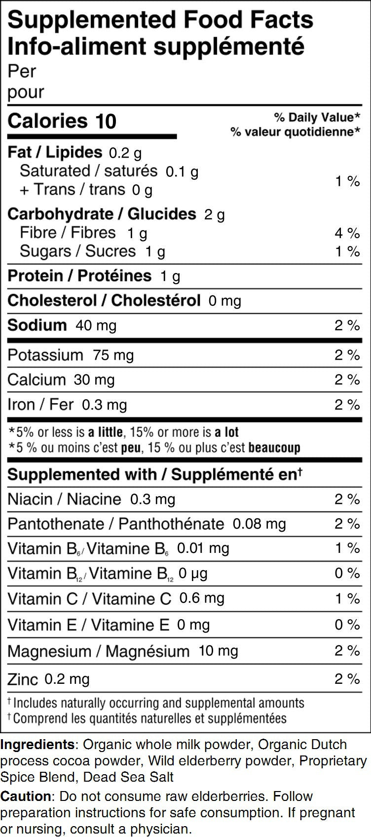 Ingredients: Organic cacao, wild elderberry, and other natural ingredients. Free from added sugars, artificial flavors, and unnecessary additives.