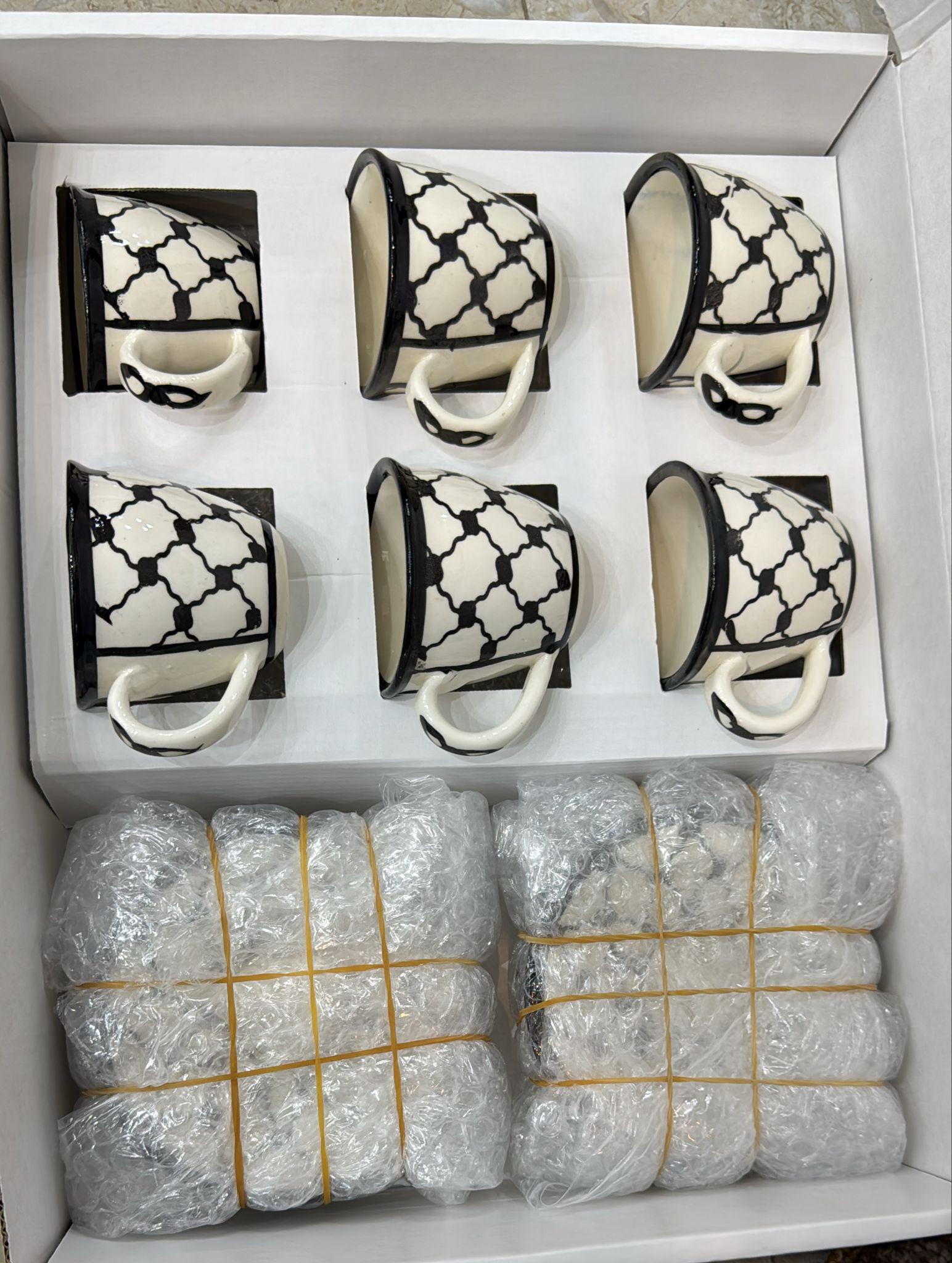 Palestinian Kufia Coffee Set featuring 6 artisan-crafted cups and matching plates. Handmade ceramic with traditional Kufia design, celebrating Palestinian heritage. Ideal for Arabic or Turkish coffee and perfect for cultural gifting.