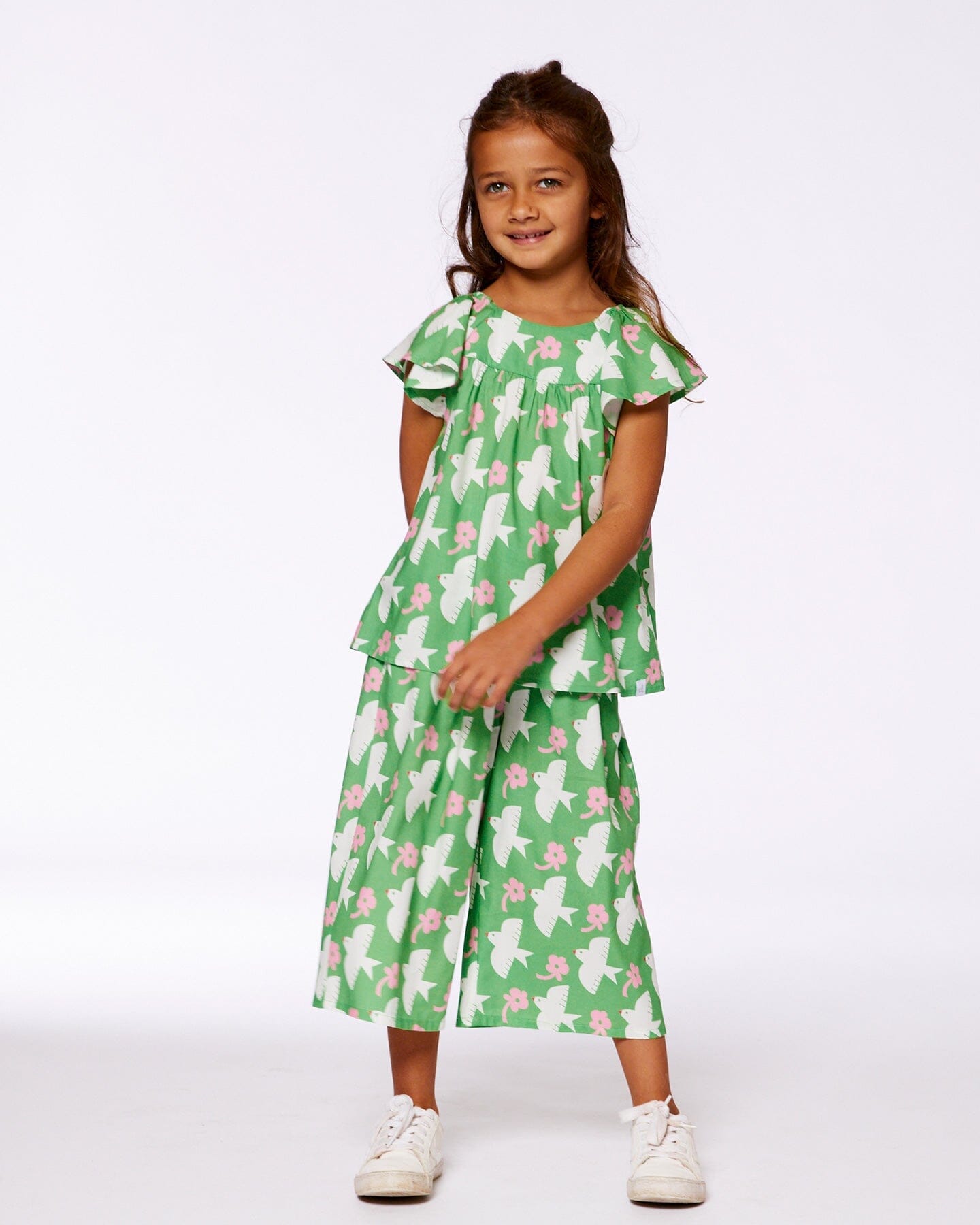 Our Printed Blouse with Flounce Sleeves Green with White and Pink Bird boasts a retro-inspired look with a vibrant, colorful print. This top features short flutter sleeves, a round neckline, and a swingy silhouette that makes it oh-so-comfortable to wear. Team it with a matching pant for head to toe coordination!