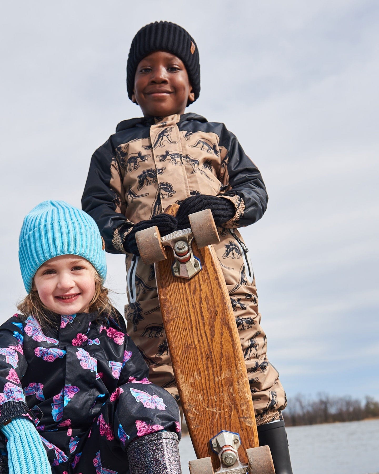 Stay warm and dry on wet, chilly days with our Printed Mid-Season One-Piece Outerwear Black Dinosaur on Beige Background. Made from waterproof and water-repellent recycled fabric, this one-piece features an attached hood, a cozy polar fleece lining, a zip front closure with a windstopper placket, and zipper pockets. An allover dinosaur print adds one-of-a-kind style!