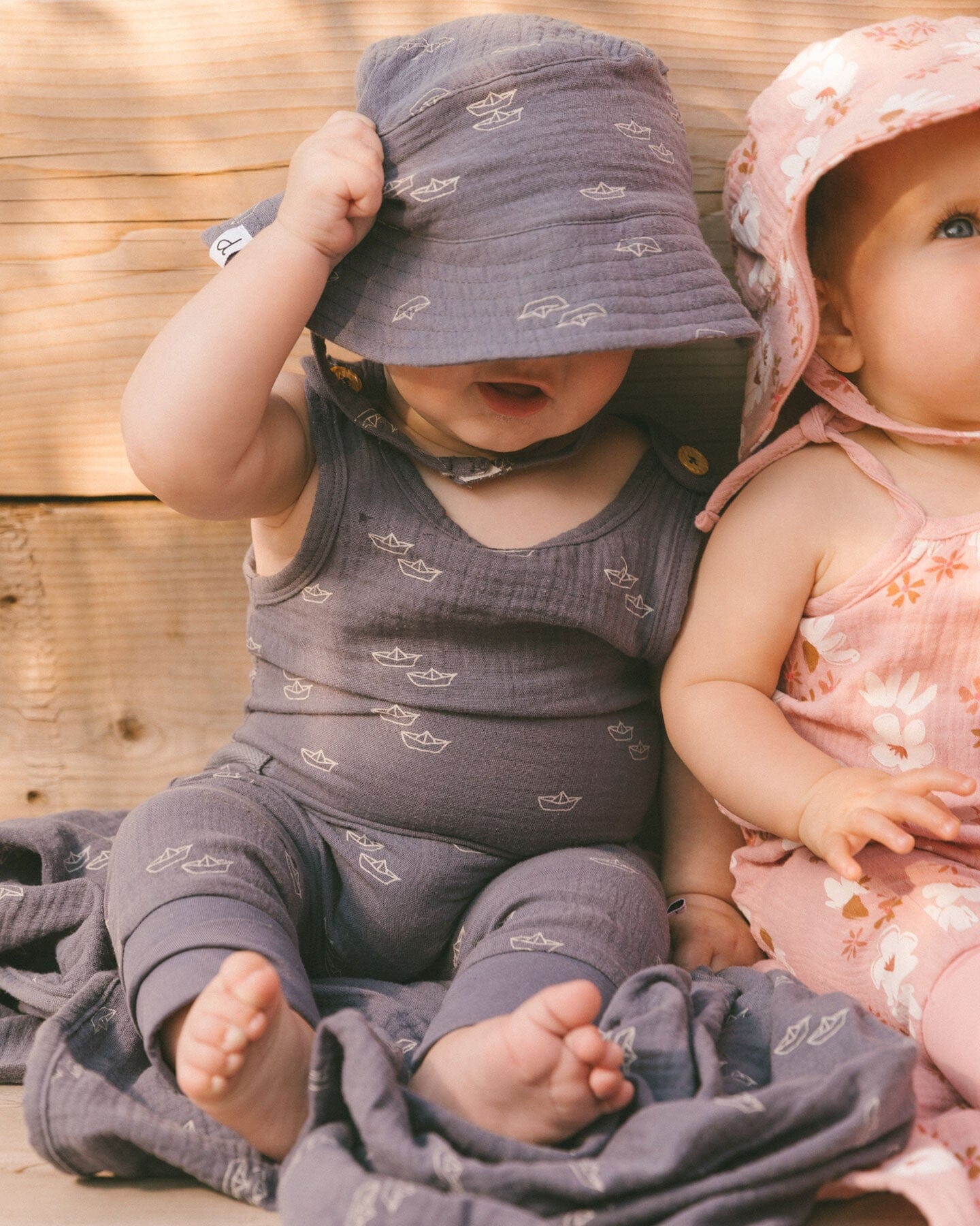 Our Printed Muslin Bucket Hat Navy Blue Paper Boats puts the perfect finishing touch on any outfit in our All Sails Out! collection. This sun hat features a flat crown, a downturned brim, a soft chin strap, and a nautical allover boat print.