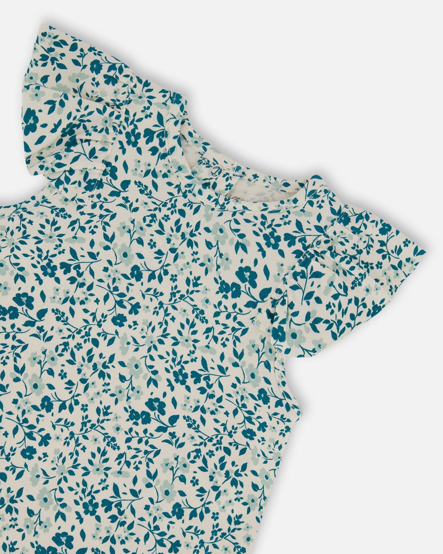 Printed Organic Cotton Romper With Frills Small Turquoise Flowers