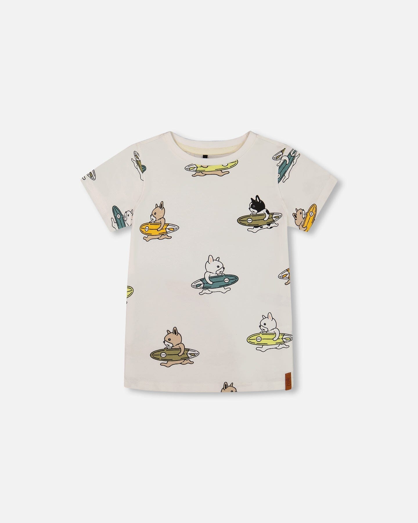With a playful dog and surfboard print, our Printed Organic Cotton Tee Multicolored Splash on Off-White adds instant style to his warm weather wardrobe. This adorable tee is made from soft stretch cotton and features short sleeves, a crew neckline, and a bold allover print.