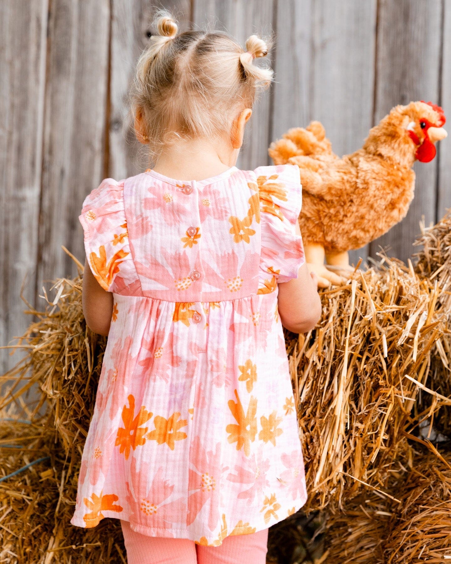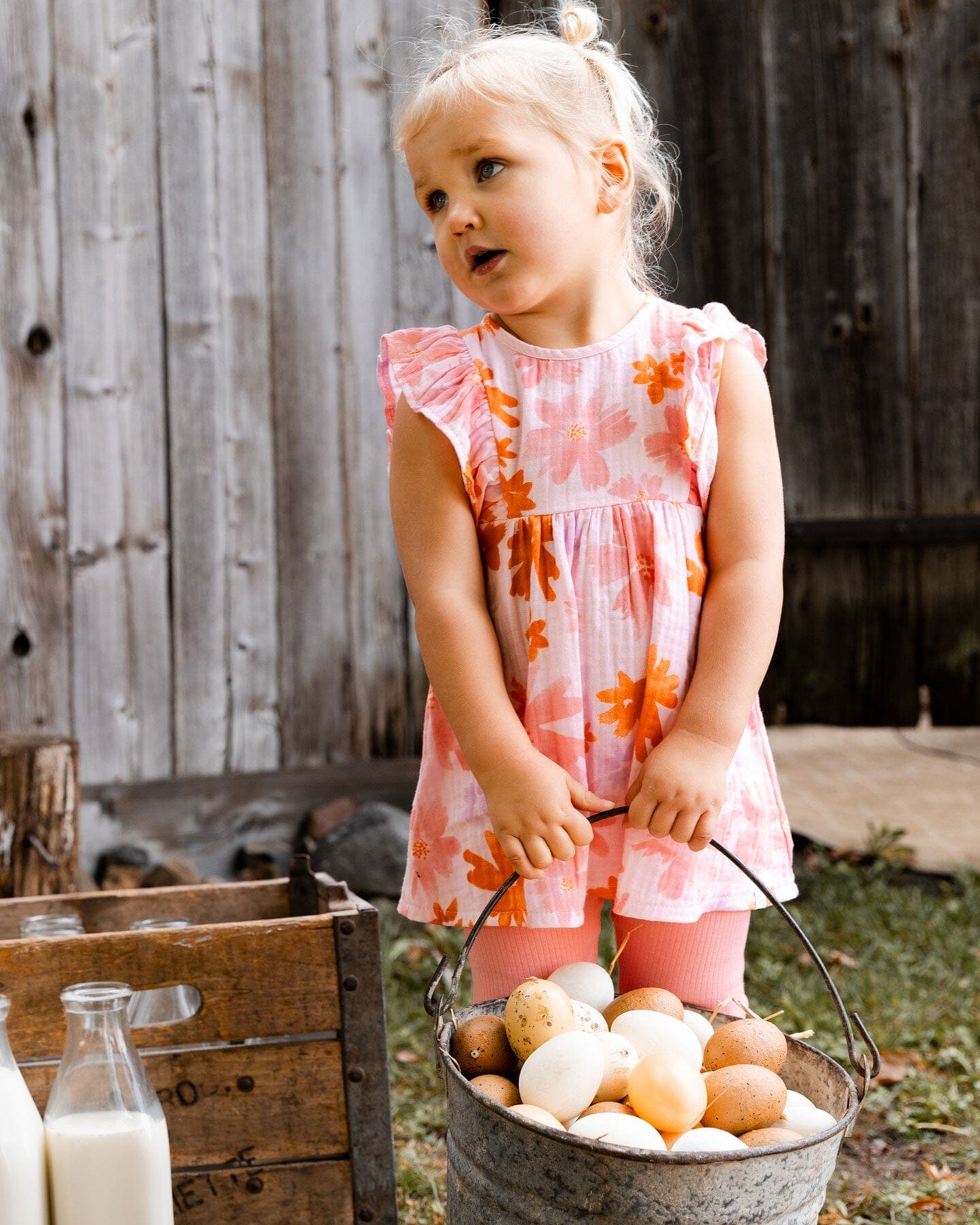 Our Printed Tunic and Solid Leggings Set Pink and Coral Flowers is made for sunny spring and summer days! This darling two-piece set features a lightweight cotton tunic top with a bold allover floral print, a round neckline, a shirred waist, and girly frills. We've teamed it with a solid ribbed capri legging that she can mix and match with any other top in our Home Sweet Home collection!