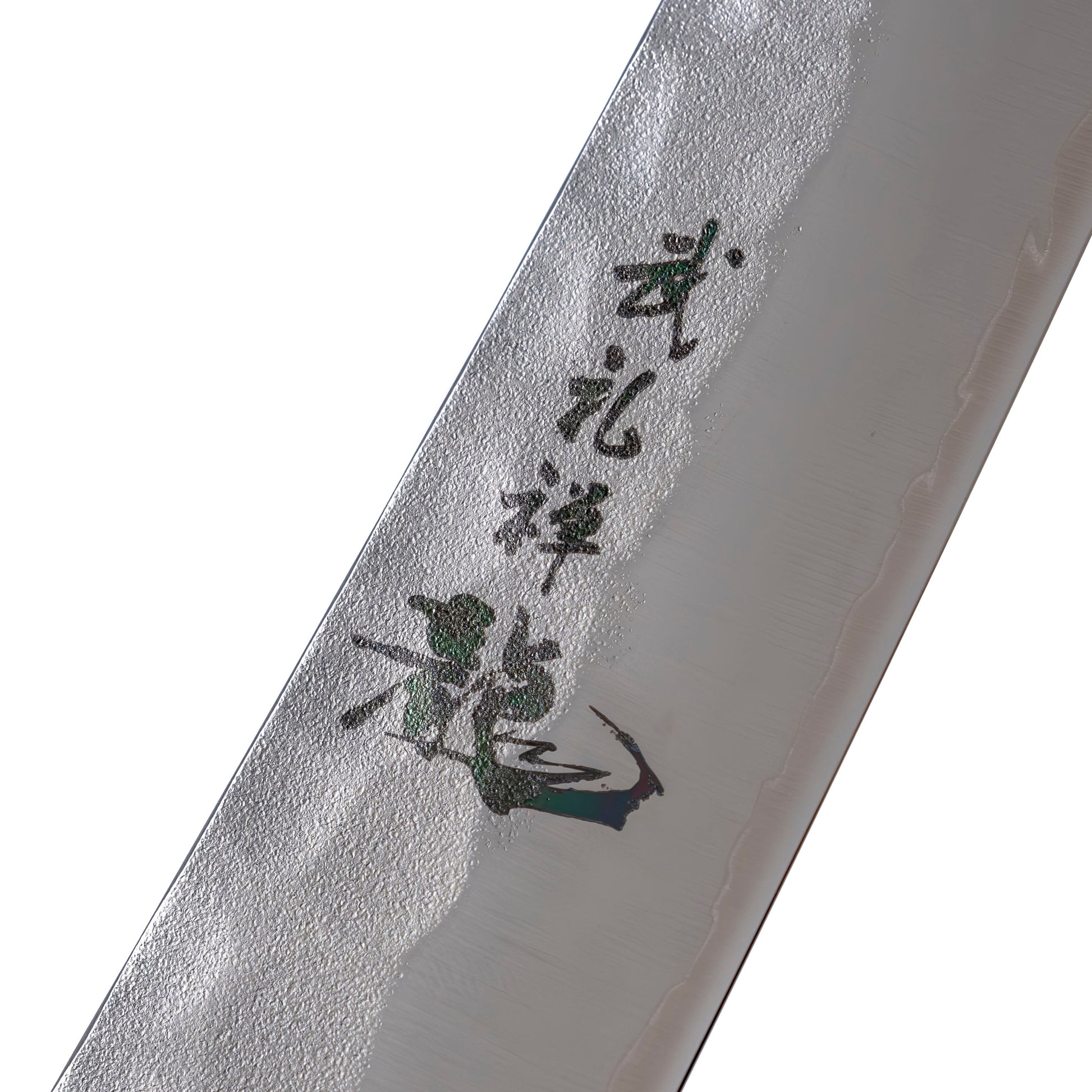 The Super Gold II, made by a top-level manufacturing method achieved by the dramatic improvement of steelmaking technology, is adopted for the blade. This ultra-high-end cutting steel material—excellent in terms of the four major properties of hardness, tenacity, wear resistance and corrosion resistance—was forged using the traditional Echizen Uchihamono forging technique. The blade has an edge where ripple patterns as beautiful as those of Japanese swords stand out, and long-lasting sharpness and durability achieved by buffing it to the utmost limit. The Blazen Ryu is a series for professional use finished by artisans with painstaking attention to detail.