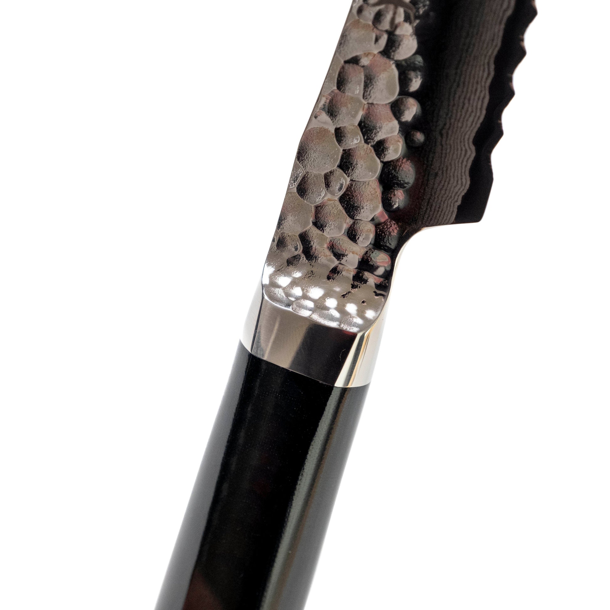 Hammered Damascus steel carefully polished by artisans is used. A high-end steel material VG-10 is used as the core (steel), which is sandwiched by 33-layer Damascus steel made by laminating and forging alternate soft and hard stainless steel sheets, achieving long-lasting sharpness. The beautiful hammered surface asperities create an air layer between the food and the blade, making the cut pieces easy to separate from the blade.