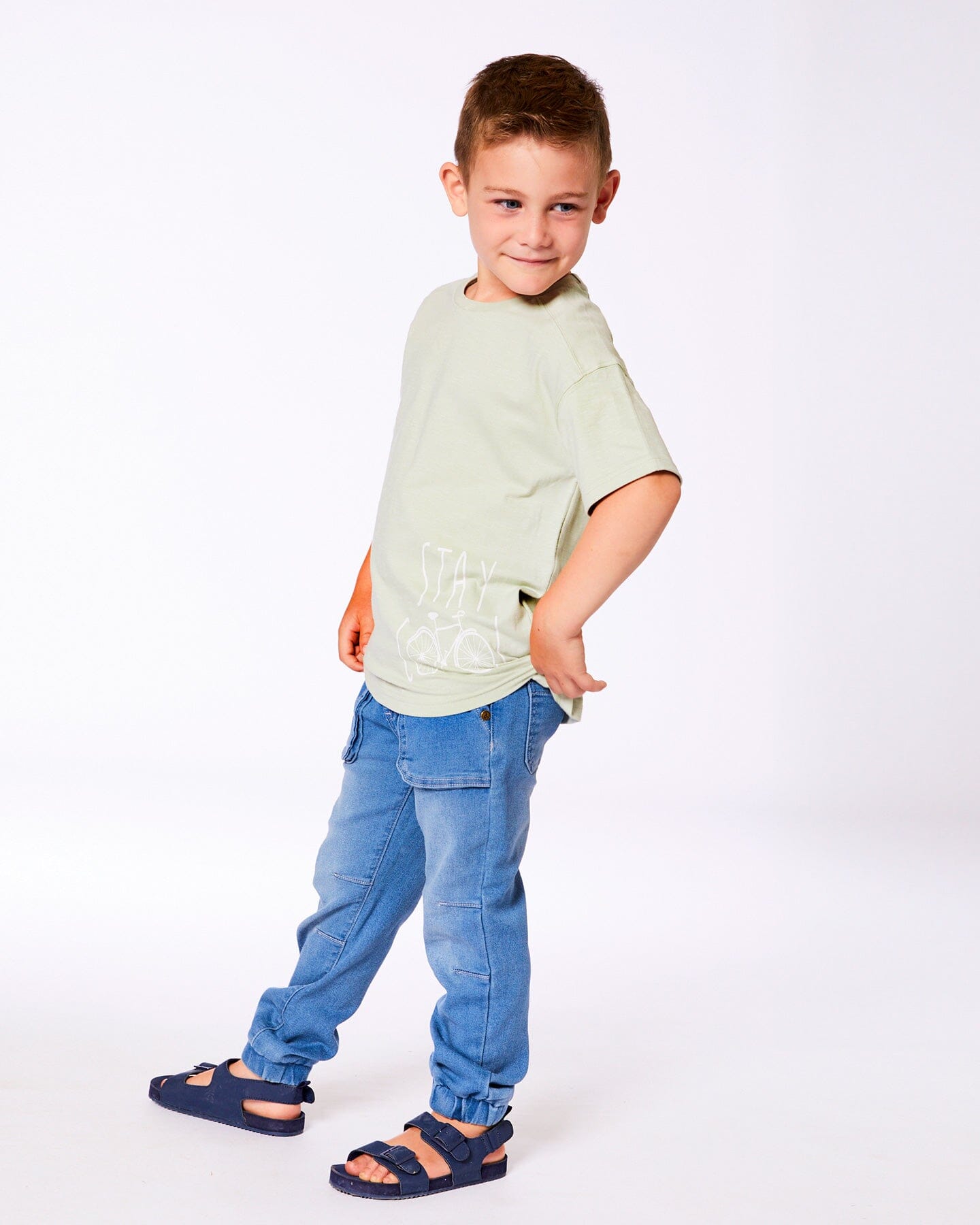 He'll look oh-so-cool this spring and summer in our Short Sleeve Graphic Tee Sage. This tee is made from soft stretch cotton and features a relaxed fit with short sleeves, a crew neckline, and forward shoulder seams. A cool bike print at the hem adds playful, distinctive style!