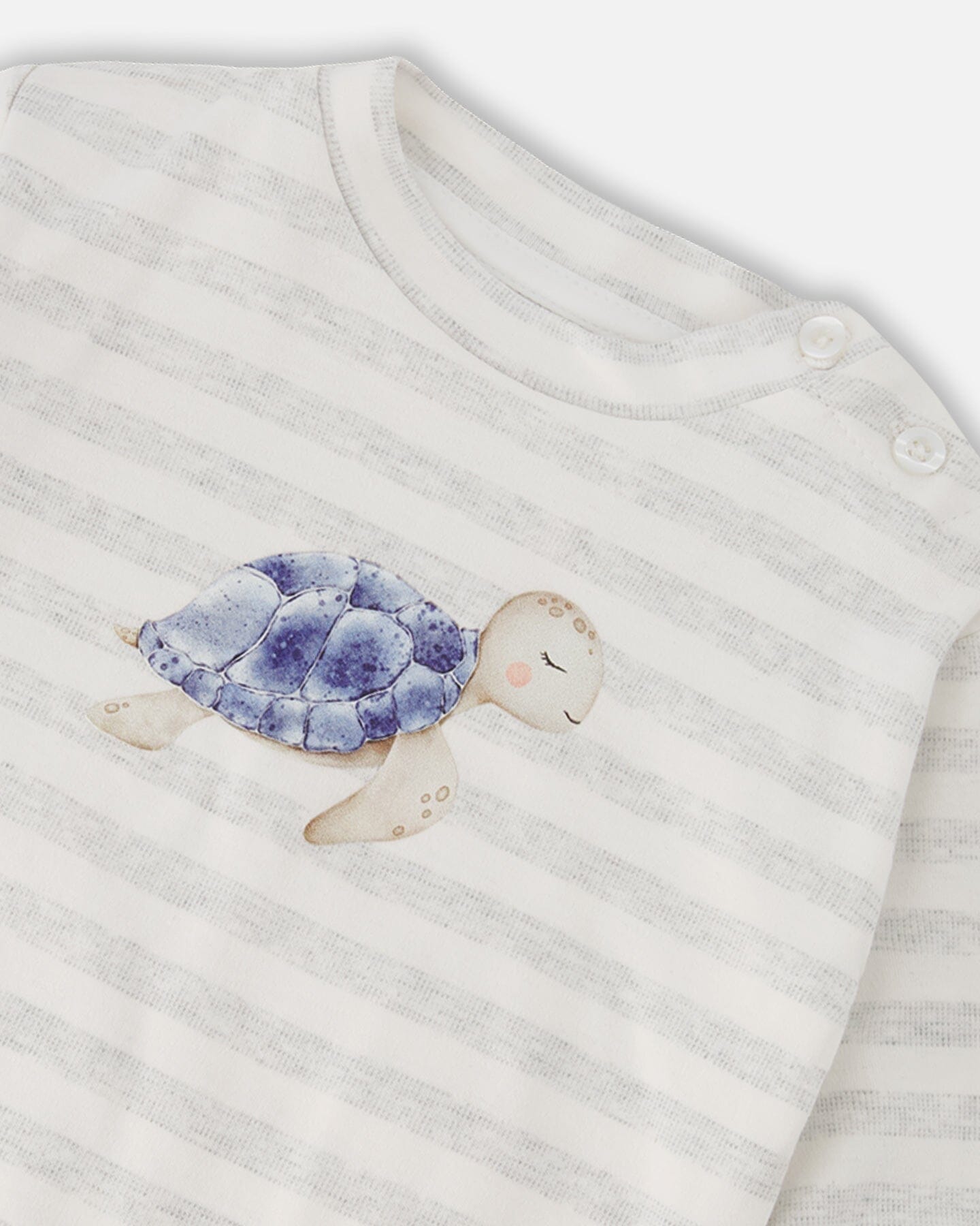 Playful and comfy, our soft jersey sweater and pants set with white and grey stripes is made for everyday adventures. The striped top features buttons at the shoulder and a sweet turtle print on the chest, while the matching pants offer a relaxed fit with an elastic waist and side pockets for practicality. Crafted in breathable cotton, this duo is perfect for keeping little boys cozy and stylish all season long.