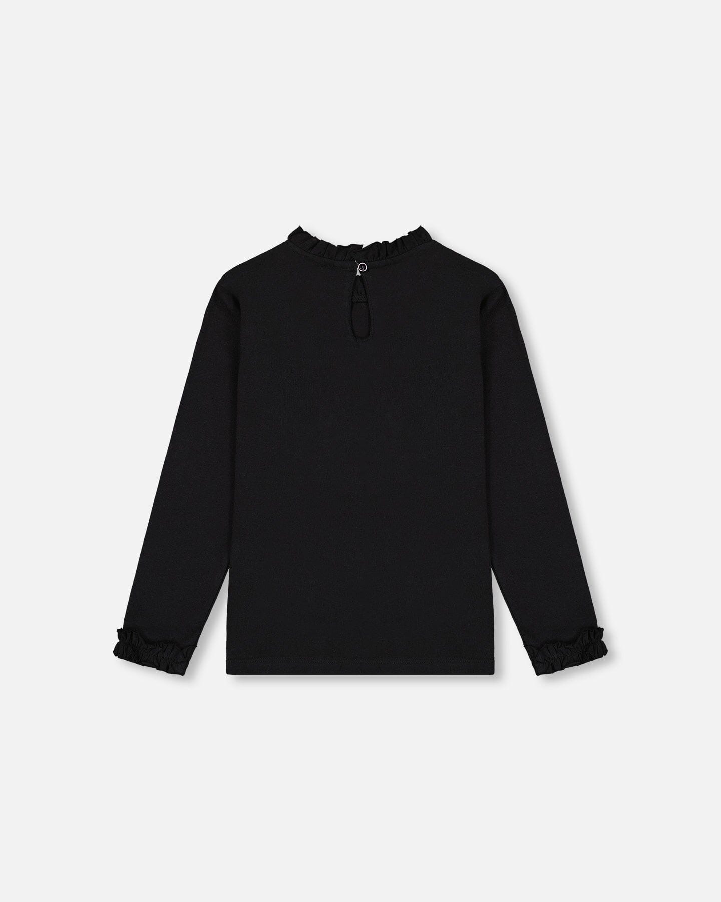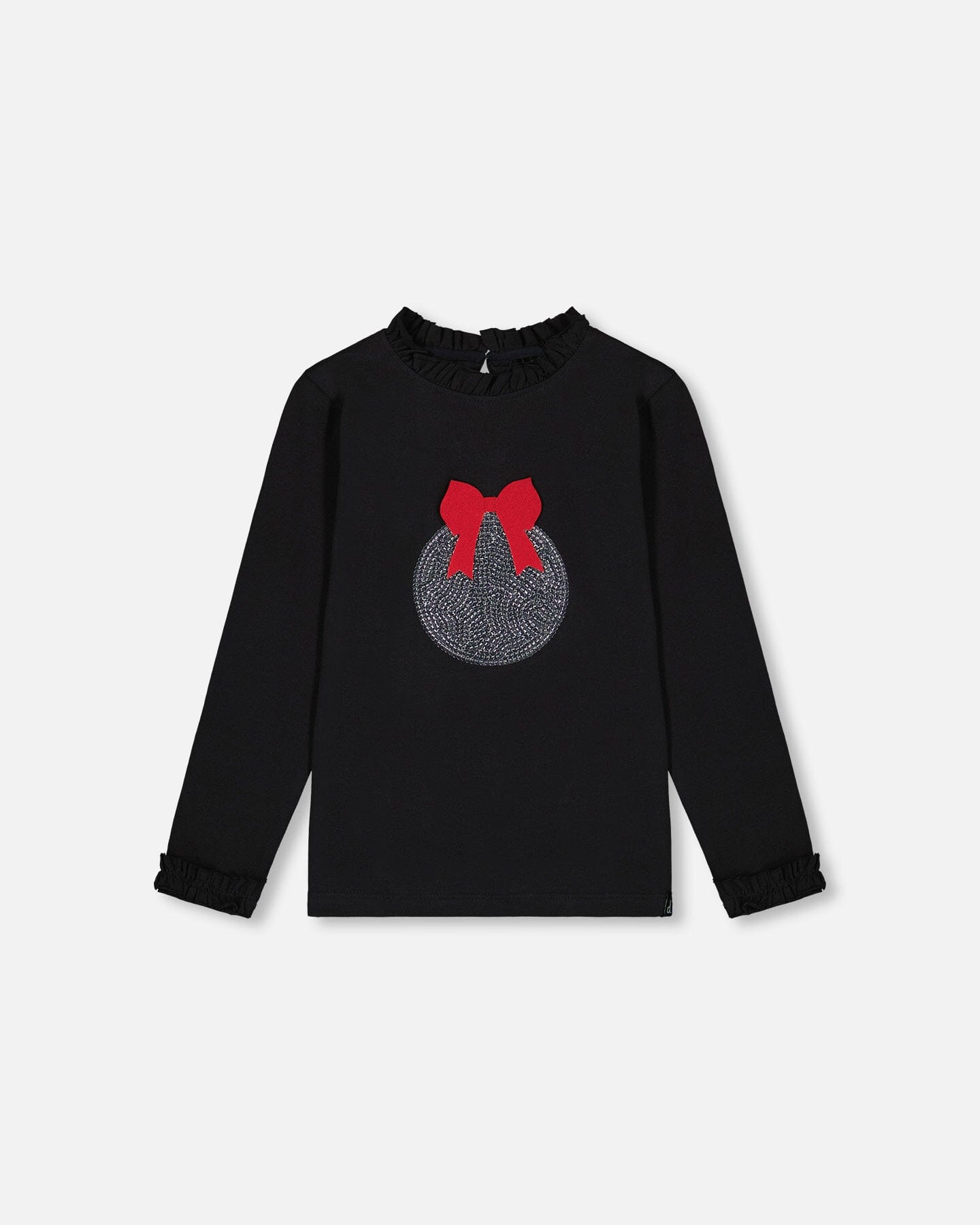 Little ruffles at the neck make our T-Shirt with Frill and Print Black extra special! In soft organic cotton fabric, this tee features long sleeves, a round neckline with little frills, and frilled accents at each wrist. A shiny ornament and bow graphic makes it perfect for any holiday party!