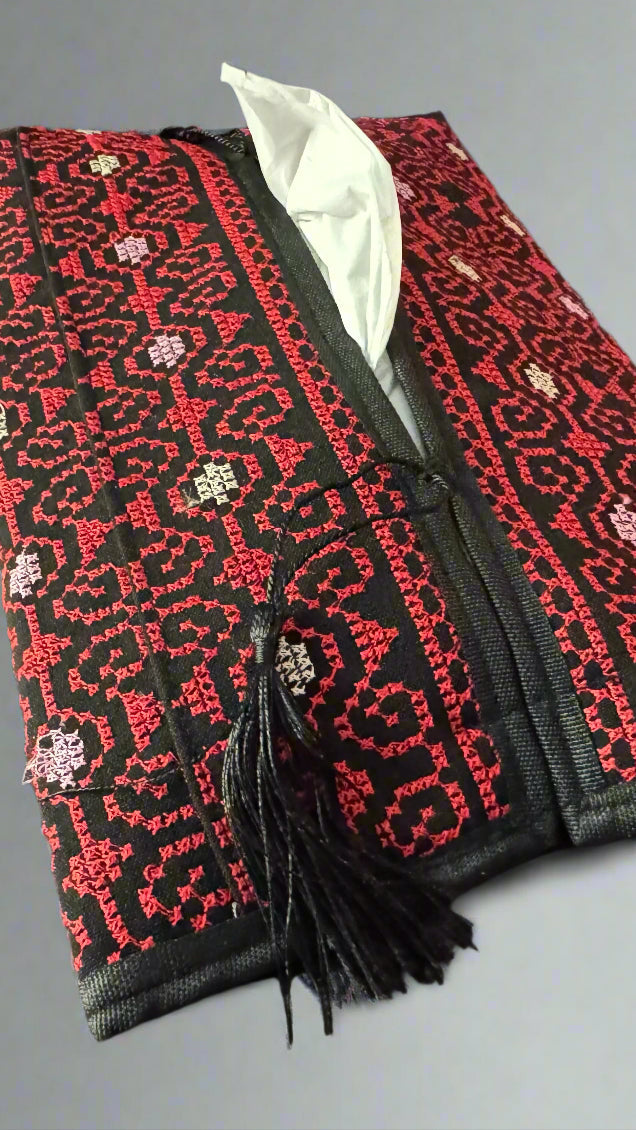 A handcrafted machine-stitched (tatreez ) fabric tissue box cover.