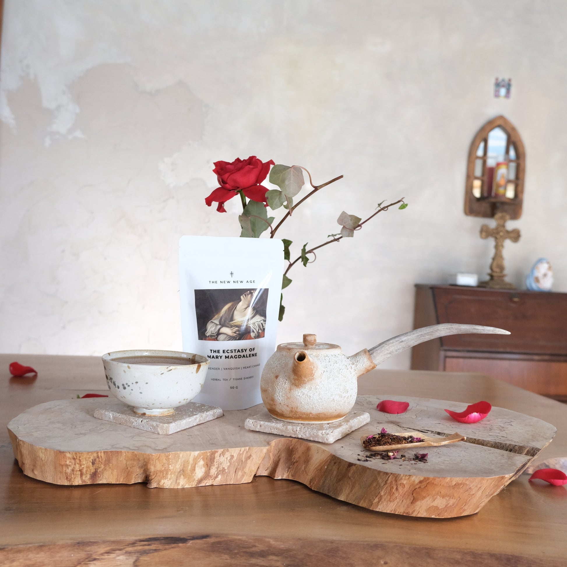Indulge in a rapturous, heart-changing herbal tea blend inspired by Saint Mary Magdalene's mystical journey of devotion and surrender.