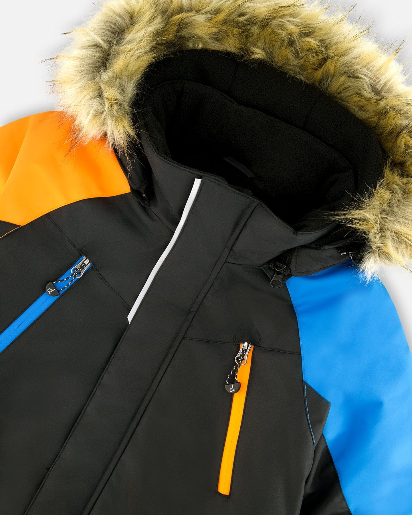 Waterproof, breathable, and insulated for cold protection down to -30°C (-22°F), our two-piece PLAY ski suit in robot dinosaur print is designed for maximum comfort, warmth, and performance in the snow. This winter snowsuit features a fleece-lined jacket with a detachable and adjustable hood, articulated sleeves for improved range of motion, elastic cuffs, a snow skirt, expandable sleeves so you can adjust the length as the child grows, and a protective wind flap and chin guard. The pants are constructed with Cordura®-reinforced panels for long-lasting durability, articulated knees, adjustable and removable suspender straps, ankle snow guards, and zippered pockets to hold ski passes and other essentials.